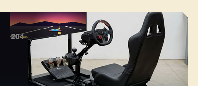Two full-motion racing-sim rigs, arcade-style screens and competitive lap leaderboards.